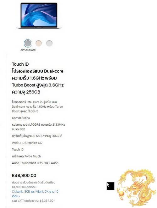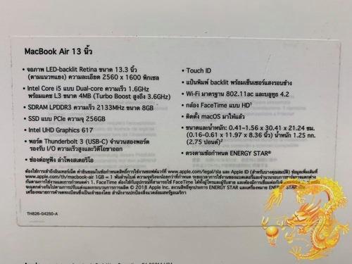 MacBook Air 13 นิ้ว Retina ปี 2018 CPU Intel CoreI5 1.6GHz Up To 3.6GHz Ram8GB SSD256GB รุ่นใหม่ Thunderbolt3(USBC) สภาพใหม่เอี่ยมอ่อง อุปกรณ์ครบยกกล่อง ประกันศูนย์ถึง 27/02/2020 ครับProcessorIntel CoreI5 Processor (1.6GHz Turbo Boost Up To 3.6GHz) เป็น CPU รุ่นใหม่ ๆ แรงเร็วครับRAM8GB Memory แรมที่ให้มามากถึง 8GB กันเลยทีเดียว แหล่มมากครับ วิ่งปรู๊ดปร๊าดแน่นอนครับHarddiskFlash Storage (SSD) 256GB รุ่นนี้เป็น SSD นะครับ ให้มาถึง 256GB กันเลยครับ แรงเร็วมากครับจอ13.3 inchs Retina LED-backlit glossy widescreen 2560x1600 pixels (high-resolution) จอเล็ก บางเบามาก ความละเอียดสูงมาก เหมาะสำหรับพกพาในยามเดินทางครับGraphic CardIntel UHD Graphic 617 (1536MB) ทำงานสบาย ๆ ลื่น ๆ ครับWebcamกล้อง Face Time แบบ HD ไว้คุยกันแบบเห็นหน้าจะ ๆ ไปเลยครับBluetoothIntegrated Bluetooth ไว้เชื่อมต่ออุปกรณ์เสริมแจ่มเลยครับOSOS Mac 10.14.5 Version ใหม่ ๆ ครับBatteryBattery Cycle Count 9 Full Charge 4446 Status Normal ใช้ได้อีกยาวนานจนลืมครับWireless LAN / LAN / ModemWireless Card AirPort Extreme ,LAN EthernetPortsUSB 3.0 Thunderbolt2 ฯลฯ