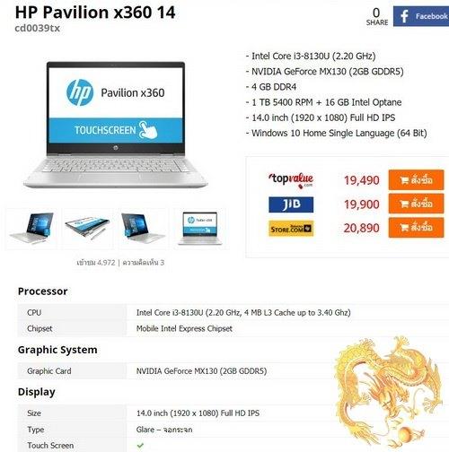HP Pavilion X360 Corei3-8130 MX130(2GBDDR5) Ram4GBDDR4 HDD1TB+SSD16GB(Optane) จอ 14 นิ้ว IPSFullHD(1920x1080) TouchScreen Win10 เป็นได้ทั้ง Tablet และ Notebook สภาพสวยงาม ประกันศูนย์ถึง 11-2020 มาขายครับพี่น้อง สำหรับ Notebook ที่เป็นได้ทั้ง Tablet และ Notebook ในตระกูล HP Pavilion X360 Touch Screen สวย ๆ งาม ๆ แรง ๆ บาง ๆ เบา ๆ CPU Intel Corei3-8130 Generation8 ที่มาพร้อมกับการ์ดจอจากค่าย NVIDIA GeForce MX130(2GBDDR5) RAM4GB DDR4 พร้อม HDD ให้มา 1TB+SSD16GB(Optane) ใช้กันเหลือ ๆ สบาย ๆ วิ่งปรี๊ด ๆ กันครับ พร้อมจอ 14 นิ้ว IPS FullHD(1920x1080) Multi-Touch Screen พร้อม Keyboard มีไฟ และ Windows10 License ของดี ๆ แบบนี้เลยเอามานำเสนอพี่น้องให้เลือกซื้อเลือกหากันครับ พี่น้องท่านใดที่กำลังมอง Notebook ดี ๆ แรง ๆ บาง ๆ เบา ๆ สักตัวไว้ทำงาน เข้ามาดูเลยครับ เป็น Notebook Pavilion X360 14-CD0039TX มาพร้อมกับความแรงของ CPU Intel Corei3-8130 Processor 2.2GHz มาพร้อมการ์ดจอ NVIDIA GeForce MX130(2GBDDR5) Ram DDR4 ให้มา 4GB พร้อมด้วย HDD ให้มา 1TB+SSD16GB(Optane) วิ่งปรี๊ด ๆ กันเลยครับ พร้อมด้วยจอ 14 นิ้ว IPS FullHD(1920x1080) Multi-Touch Screen พร้อม Keyboard มีไฟ มากับ Windows10 License เพื่อการทำงานที่ลื่นไหล และ USB3 เพื่อการโอนถ่ายข้อมูลที่รวดเร็ว พร้อมกับ HDMi Port สำหรับพี่น้องที่ชื่นชอบการดูหนัง เครื่องศูนย์ไทย Keyboard ไทย สภาพดี สวยงาม ประกันศูนย์อีกยาวนานถึง 04/11/2020 ครับ อุปกรณ์ มีตัวเครื่อง สายชาร์จ Adaptor ปากกา และ กระเป๋า มาชมรายละเอียดกันเลยครับ ภาพรวมสินค้า HP Pavilion X360 14-CD0039TX เป็นได้ทั้ง Tablet และ Notebook มาพร้อม CPU Intel Corei3-8130 NVIDIA GeForce MX130(2GBDDR5) RAM4GB HDD1TB+SSD16GB(Optane) วิ่งปรี๊ด ๆ และจอ 14 นิ้ว IPSFullHD(1920x1080) Multi Touch Screen Keyboard มีไฟ พร้อม Windows 10 License สภาพสวย ประกันศูนย์ถึง 04/11/2020 ครับ CPU Intel Corei3-8130 Processor (2.2GHz) CPU ทำงานหนัก ๆ ลื่น ๆ สบาย ๆ ครับพี่น้อง RAM 4GB DDR4 แหล่มครับ เป็น RAM DDR4 ให้มา 4GB เพียงพอใช้งาน สบาย ๆ ครับ HDD HDD1TB(1,000GB)+SSD16GB(Optane) ให้มาใช้แบบสบาย ๆ เหลือ ๆ วิ่งปรี๊ด ๆ กันเลยครับ การ์ดจอ NVIDIA GeForce MX130(2GBDDR5) การ์ดจอรุ่นใหม่ ๆ ที่พกพาเอา Memory ในตัวการ์ดจอมาด้วยถึง 2GBDDR5 ลื่น ๆ ครับ จอ 14.0 Inchs IPS FullHD(1920x1080) Multi Touch Screen ให้ภาพที่สวยงาม สบายตา และ Keyboard มีไฟ ทำงานสะดวกในเวลากลางคืน Bluetooth Integrated Bluetooth ไว้เชื่อมต่ออุปกรณ์เสริมครับ Webcam Integrated Webcam ไว้คุยกันแบบเห็นหน้ากันจะ ๆ ไปเลยครับ Card Reader Multi-In-1 card Reader ไว้อ่านรูป อ่านไฟล์ครับ OS Windows 10 License พกพาติดตัวไปใช้นอกสถานที่ สบายใจไร้กังวลด้วย Windows แท้ Wireless LAN / LAN Intel WiFi 802.11 B/G/N, 10/100 BaseT Ethernet LAN Ports HDMi Port และ USB3, VGA, RJ-45 ฯลฯ