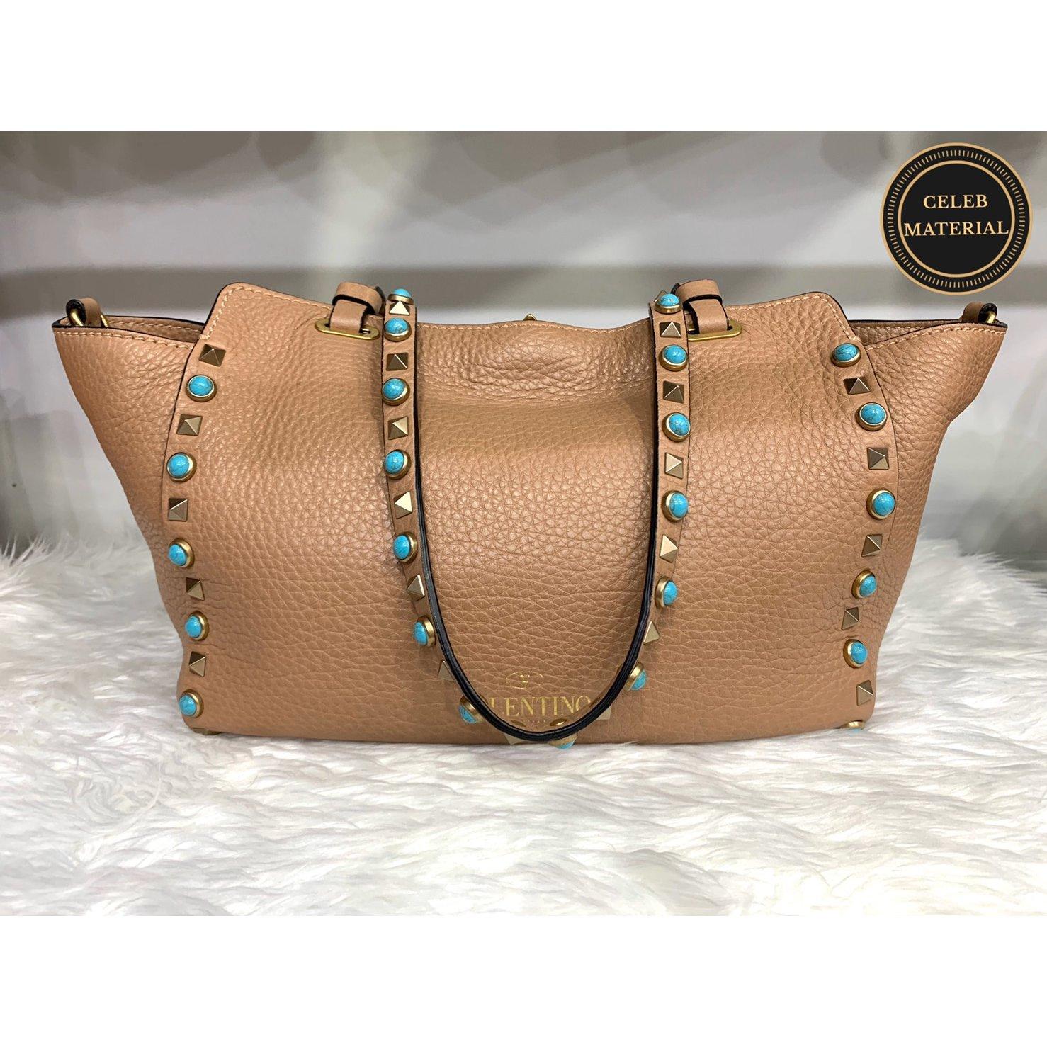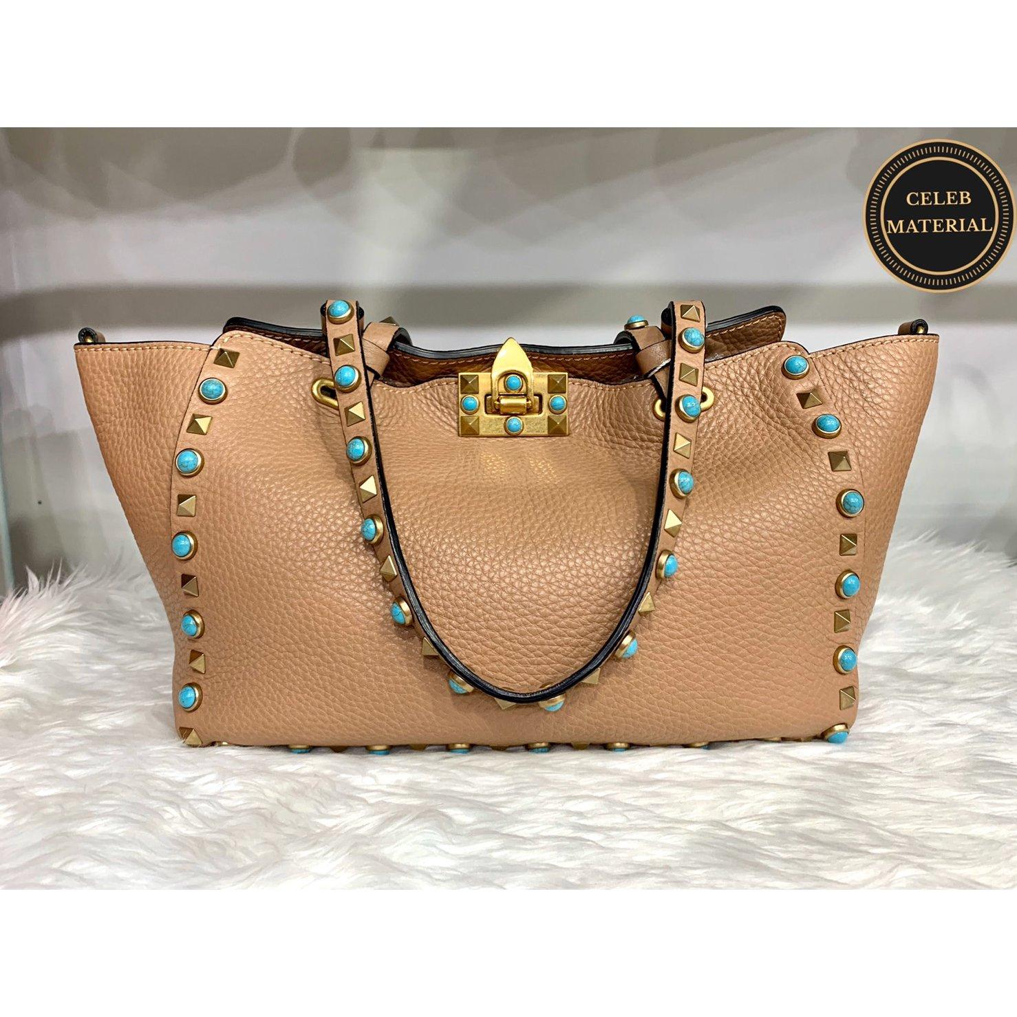 VALENTINO Gold/Turquoise Rockstud Rolling Medium Tote Bag ,