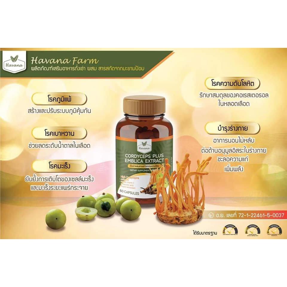 ด้วยสรรพคุณและคุณประโยชน์ที่มีมากมายในถั่งเช่า Havana Farm จึงนำวิตามินซีจากมะขามป้อมมาใช้เป็นส่วนผสมเพื่อเพิ่มประสิทธิภาพในการดูดซึมสารสำคัญในเห็ดถั่งเช่า ซึ่งมะขามป้อมนั้นนอกจากเป็นผลไม้ที่มีสารต่อต้านอนุมูลอิสระอย่างวิตามินซีสูงมากๆแล้ว ยังช่วยบำรุงผิวพรรณให้ขาวกระจ่างใส ลดการเกิดริ้วรอย แก้หวัด แก้ไอ และลดน้ำตาลและไขมันได้อีกด้วย
